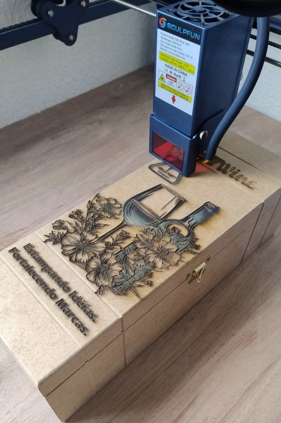 * Madeiras – O efeito queimado do laser na madeira gera um visual rústico e elegante, perfeito para caixas personalizadas, utensílios, placas e artigos de decoração.